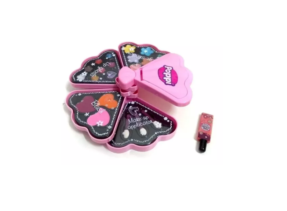Contiene- 6 sombra de ojos- 8 brillo labial- 3 rubor- 1 esmalte de uñas- 3 aplicadores- 1 espejo.